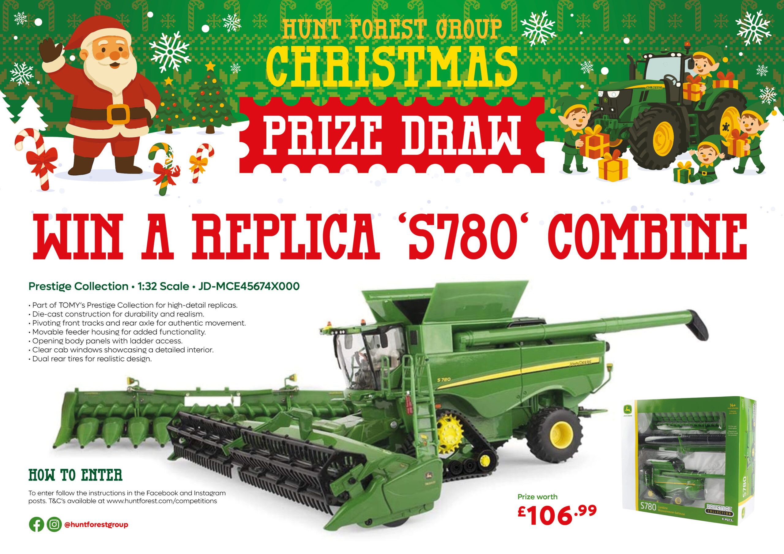 The festive season is here, and to celebrate the launch of our Christmas Gift Guide later this week, Hunt Forest Group is spreading some Christmas cheer with an exciting giveaway! One lucky winner will take home a John Deere 1:32 Scale S780 Combine Model – a stunning collector’s piece worth £106.99.